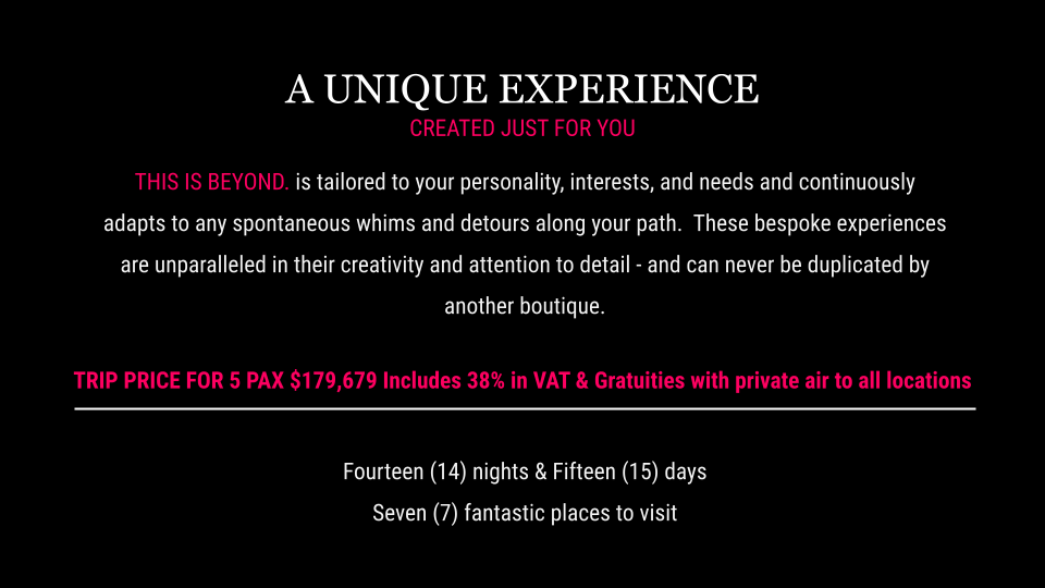 is a boutique travel design firm specializing exclusively in private air journeys. Each experience begins with the perfect aircraft and unfolds across 4 to 8 handpicked locales within a single country — all executed with flawless precision by our European-trained butlers.